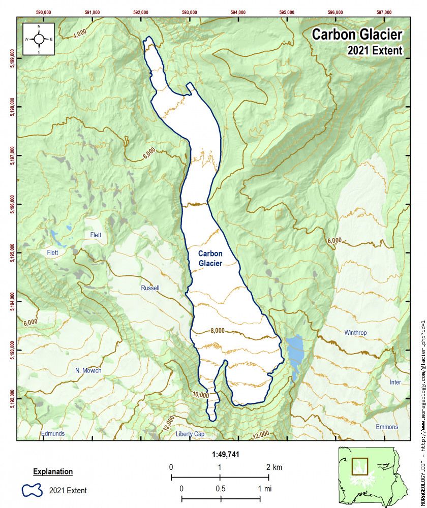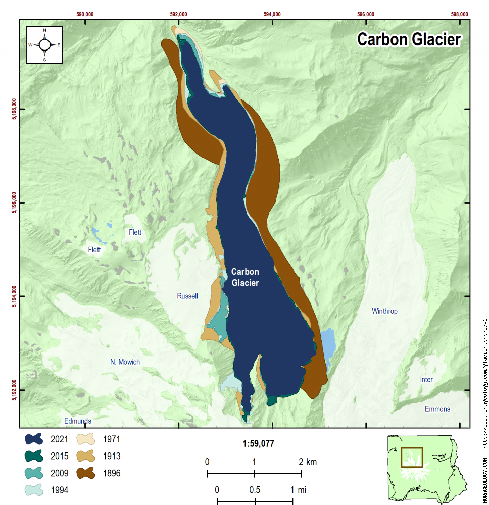 \(c_i\) = The glacier-specific scaling parameter (back-calculated from glacier area and volume in 1971 in Driedger and Kennard (1986); Method described in Beason et al. (2023). The value for the Carbon Glacier is 0.041335 (this is also listed above the volume graph);