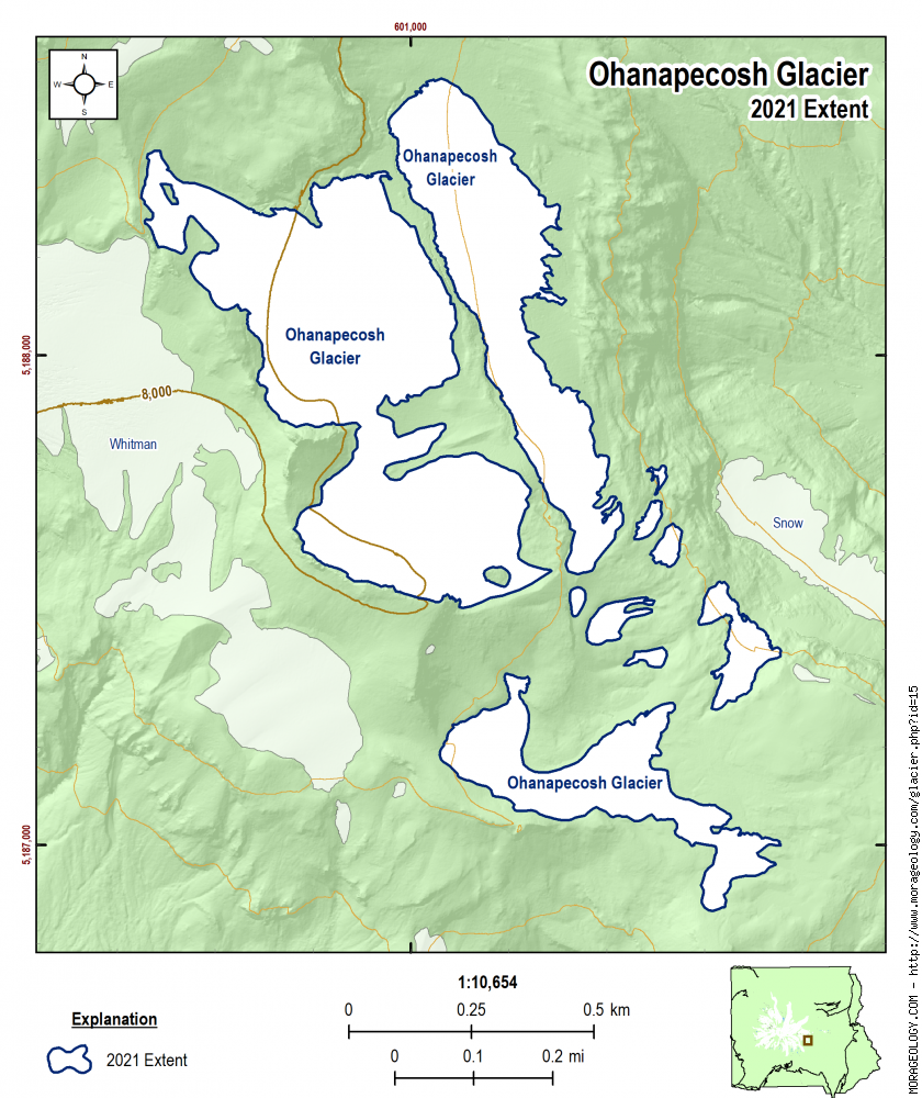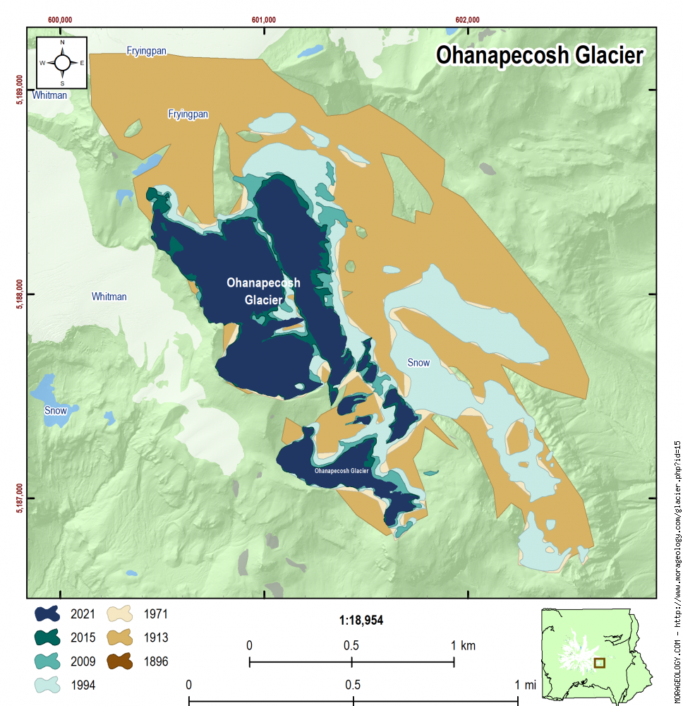 This is essentially an average of the back-calculated Dreidger and Kennard (1986) and Nylen (2001) methods (D&K is in the first parenthesis; Nylen in the second). For example, for the Ohanapecosh Glacier in 2021, you can find the following individual volumes: