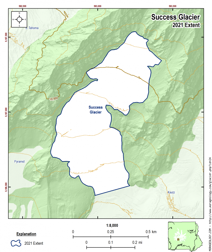 \(c_i\) = The glacier-specific scaling parameter (back-calculated from glacier area and volume in 1971 in Driedger and Kennard (1986); Method described in Beason et al. (2023). The value for the Success Glacier is 0.023702 (this is also listed above the volume graph);