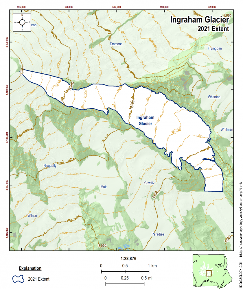 NOTE: The data shown here is based on the 2021 glacier update at Mount Rainier, and should be considered the most up-to-date data on glaciers at the park (2023-04-06).